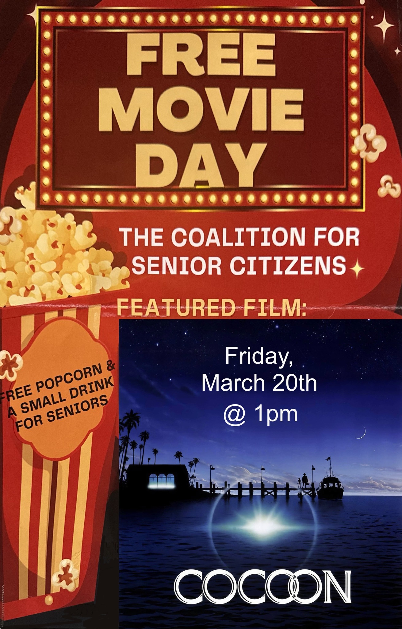 March’s “Third Friday” Senior Matinee! Kelli Perez Uncategorized March 5, 2026March 7, 2026 All are welcome to attend, but senior citizens 60+ will receive a free small drink and small popcorn courtesy of The Coalition for Senior Citizens!